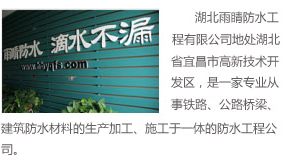 湖北雨睛防水工程有限公司地處湖北宜昌高新技術公司獲得了國家質量管理體系認證證書,也取得了湖北省建筑防水材料專業(yè)協(xié)會會員資格;并榮獲了湖北省建設廳頒發(fā)的建筑施工貳......[更多]
